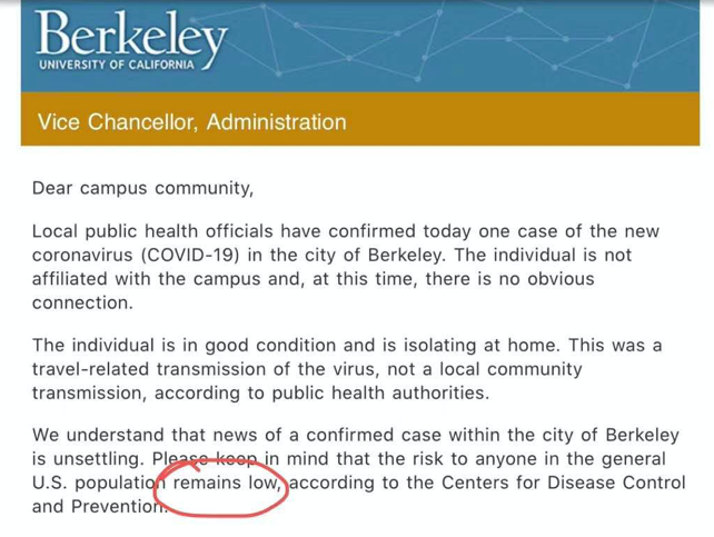 面对新冠肺炎,学校中出现了大量停课的声音。网络中也出现了传闻称已经有数所公立大学准备停课。可是UC Berkeley毕竟是一个连地震学生都不跑的地方,学校随后对于停课的消息表示了否定,并称目前当地的疫情 还处于“低风险”状态 。