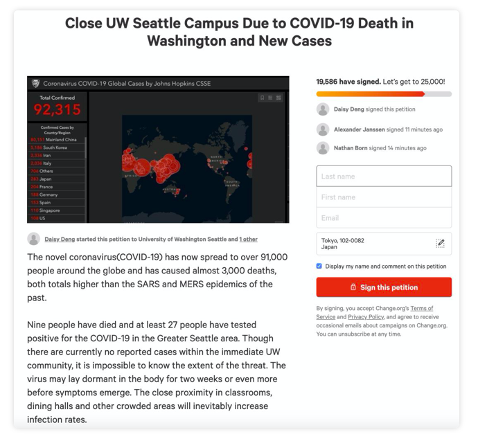 针对这一情况,忧心忡忡UW学生发起了关于“关闭校园”的voting。截止目前已经有接近20000名学生签名对此表示了支持。