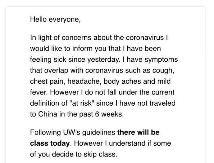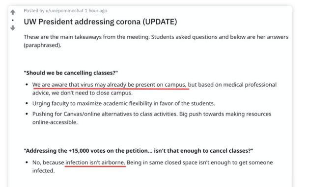 针对学生们的提议,UW随后给出了回应。一位学生把学校回应的记录发布在了Reit中。在他整理的记录中表示,虽然 UW官方知道校园内可能已经有感染者存在 ,但是根据医学专家建议,现在还没有必要关闭校园。