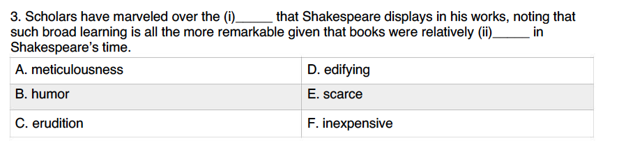 解析:这是一个两空题,我们先看一下前三个选项的意思: A.一丝不苟;B. 诙谐;C. 博学;后面一个三选一的题我们也来看一下选项的意思:D. 启发、教诲;E. 缺乏;F. 便宜的。我们回过头来看一下题目吧,这道题目的前半部分的大意是:学者marvel over惊叹于莎士比亚在他的作品中展现的( ),noting开始,就是对前半句话的解释:为什么学者要惊叹。后半句从noting开始的大意是:值得注意的是莎士比亚如此广博的学识是在他这个时代书籍产量相对( )的情况下拥有的。noting开始是为了解释前半句话,但是从given开始是为了对noting that....remarkable这段文字做进一步的说明。这段话中,broa learning和前一个空是对应的,所以我们要选择C,但后一个空”given”有一点转折意味在其中,要为了衬托莎士比亚的广播学识,那么我们只能选择E,在那个书籍相对匮乏的年代,他竟然能达到这样广博的学识,这个是让人惊叹的。