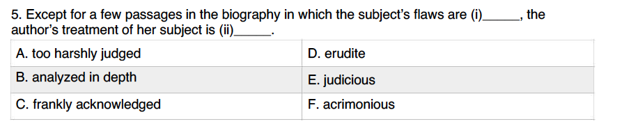 解析:Except for奠定了整句话前后意思是相反的,而我们要选择的两个空正好在前后分句中,这意味着我们要选择的两个选项意思是相反的。好的,我们还是来看一下前后选项。A. 被非常严厉地评价,风评不是很好;B. 很有深度地分析;C.表述很直白;D. 博学广识的;E. 明智的,聪明的;F. 讽刺的。那么我们来看看句子可能表达的意思,除了对一些传记文章的处理上的瑕疵被( ),那么这里大概率是被批评,如果我们选择了A,后面就可能是D或者E,显然对于一个话题的处理我们应该说“聪明、明智”而不是“广博”,所以后面一空我们应该选择E。