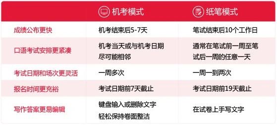 那么,机考模式VS纸笔模式有什么不同,从下表我们能够了解到机考模式的 出分快、一天考完四科、一周多次 等等优势。