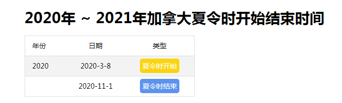 从2007年开始,加拿大遵从北美夏令时标准,每年3月第2个周日开始夏令时并把时钟往前调1小时,每年11月第1个周日结束夏令时并把时钟往后调1小时。以2017年为例,加拿大2017年夏令时从3月12日开始,到11月5日结束。