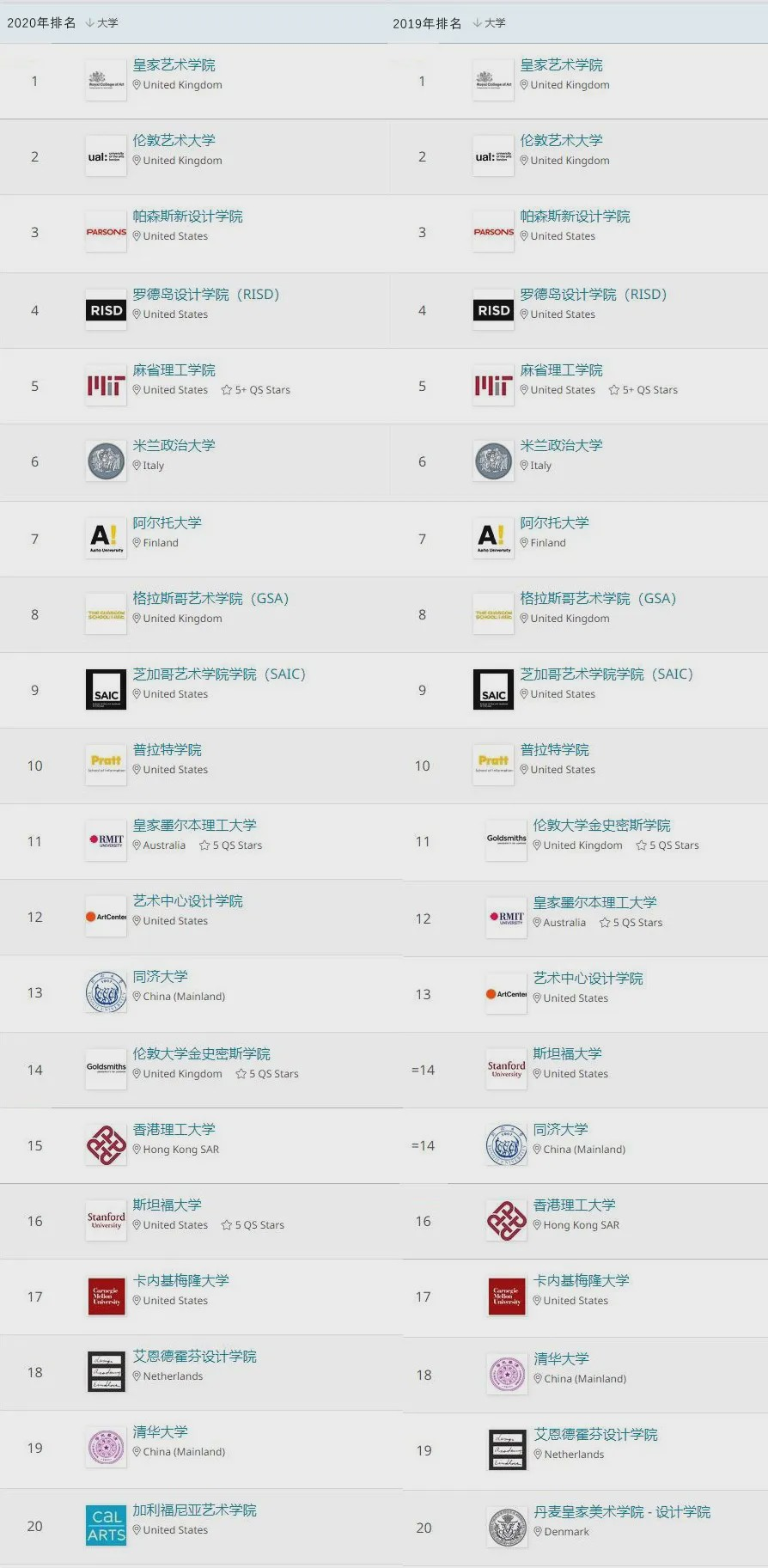 与2019年排名相比,TOP10位置没有变化;TOP10-TOP20中,院校排名变化较大,皇家墨尔本理工大学与艺术中心设计学院并肩上升一位,分别位列第11位和第12位。