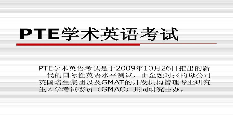 PTE学术英语考试是于2009年10月26日推出的新一代的国际性英语水平测试,由金融时报的母公司英国培生集团以及GMAT的开发机构管理专业研究生入学考试委员(GMAC)共同研究主办。