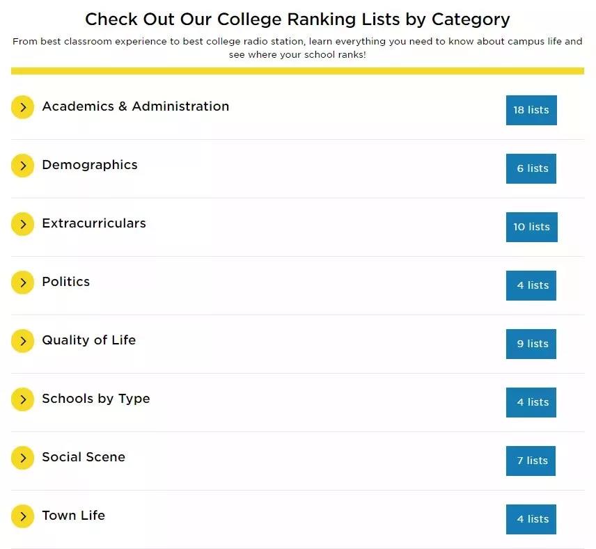 今年对385所美国大学的14万在校学生进行了调查,平均每所大学调查学生人数为359名,每名学生需回答80多个问题,包括:课堂体验、教授水平、实验设备、就业支持、图书馆、学校管理水平、学生幸福感、校园风景、食堂、宿舍等等。