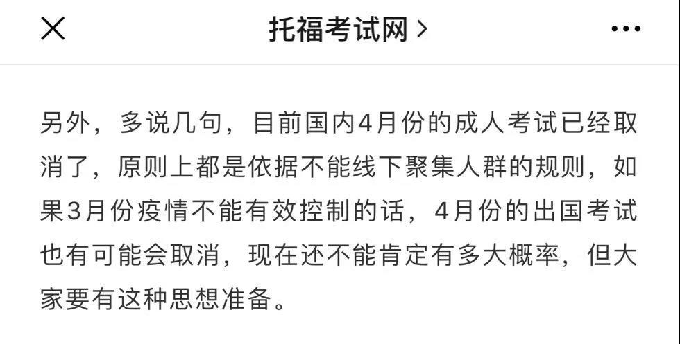 1、4月份的托福考试极有可能取消,因为国内教大型一些的考试4月份成人自考已经取消,所以也不建议托友们报考4月份考试,但已经报名的也别着急取消,最终是否取消要等NEEA最后敲定。这个在前天托福君的文章中也已经提到。最新!ETS再发通知,全球多地取消3月托福考试!