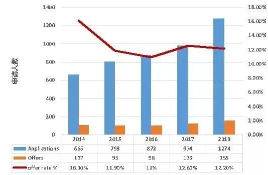 虽然牛剑暂未公布2020年的具体数据,但从官方给出的往年情况来看,牛剑每年的中国高中生申请人数涨幅更为明显,高于offer涨幅,因此 整体录取率依然呈下降趋势 。