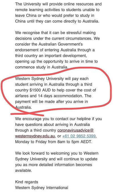 西悉尼大学将会给经第三国返回澳洲的同学们每个人1500刀补贴,用来补助在第三国的机票费和14天住宿,这笔钱会在同学们到达澳洲后陆续发放。