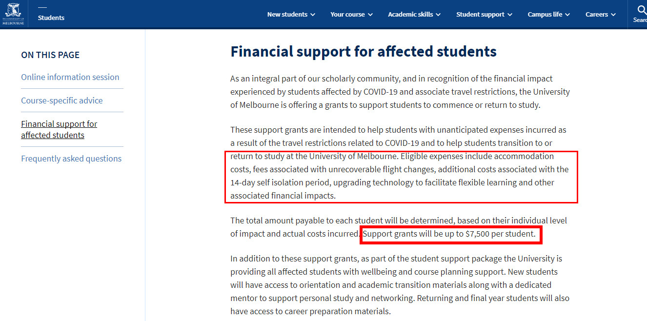 墨尔本大学官方发布,正在为受冠状病毒和相关旅行限制影响的学生提供一项支持计划其中包括最高7500澳元的补助金支持!