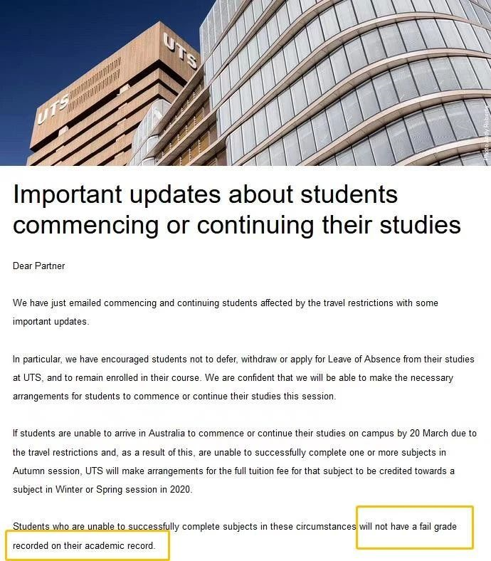 UTS官网官宣福利:鼓励同学们继续入读2020年第一学期如果无法在3月20日前抵达澳洲校园开课并由此引起的挂科UTS来为你买单免费提供该门科目下学期重修的机会同时,不会留下你的挂科记录。