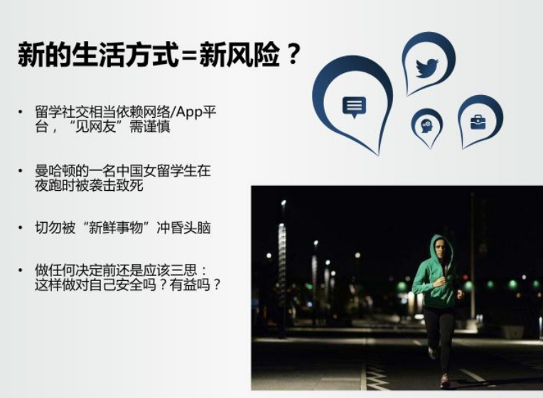 安全防范-建立安全意识避免高危险活动留学生日常出行是最容易发生安全问题的途径。安全意识的建立就是从一些不起眼的事情注意的。前几天的章莹颖事件就是一个警示。