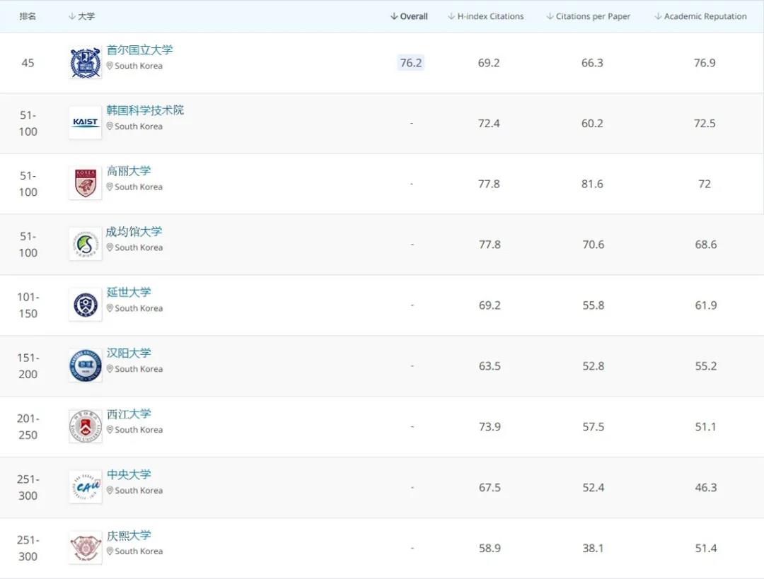 2020年QS排名,会计与金融学专业,韩国上榜学校如下图。