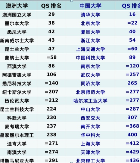 2019/2020 QS世界大学排名 中澳大学排名对比 世界大学排名前300:澳洲占18所(澳洲总共41所大学,39所公立, 2所私立),中国12所;