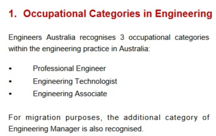 澳大利亚工程师协会(EA)认可一下3种职业,Professional Engineer , Engineering Technologist, Engineering Associate. 为了移民的目的,Engineering Manager 也是在认可的范围之内。