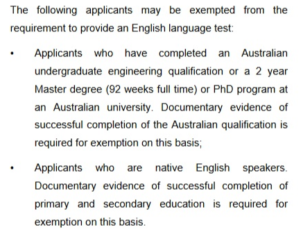 划重点:满足以下条件,可能会被豁免语言。申请人完成澳洲的工程本科学位或者在澳洲大学完成2年制硕士(92周全日制学习)或者博士学位课可以申请英文豁免。意思就是说在澳大利亚上的工程本科或者硕士(2年以上的全日制学习),可以申请英文豁免。但是,在做移民的时候,必须雅思达到四个六以上,因此,同学们,语言关还是要过。只不过是语言还没到要求时,你可以先把职业评估做了,然后你们加油刷雅思,雅思四个六的成绩,还是不难,努努力,就可以了。