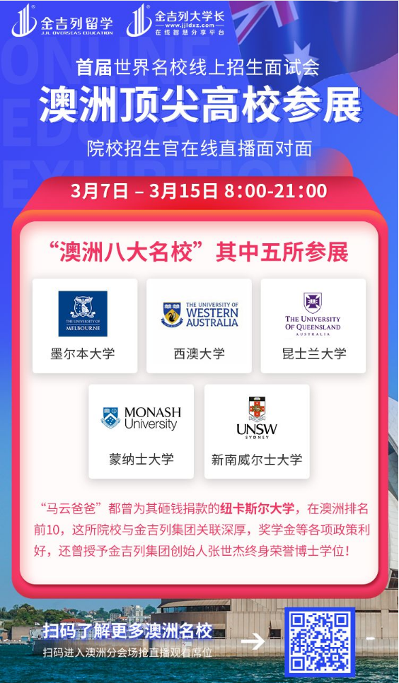 此次招生面试会中, 金吉列大学长将邀请澳洲八大名校中的五所院校招生官(墨尔本大学、昆士兰大学、新南威尔士大学、蒙纳士大学、西澳大学) ,与你分享各个院校的王牌专业、留学费用以及就业规划等方面的留学新动向;同时还会为大家提供在线面试和评估,包括审阅学生资料和各类成绩,做1V1指导和详细的留学答疑。