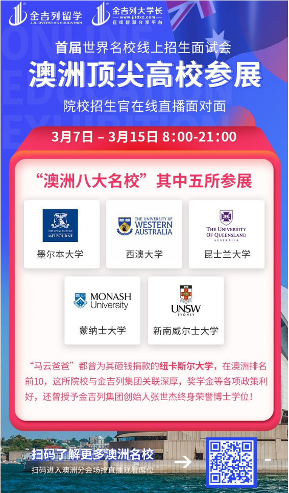 此次招生面试会中, 金吉列大学长将邀请澳洲八大名校中的五所院校招生官(墨尔本大学、昆士兰大学、新南威尔士大学、蒙纳士大学、西澳大学) ,与你分享各个院校的王牌专业、留学费用以及就业规划等方面的留学新动向;同时还会为大家提供在线面试和评估,包括审阅学生资料和各类成绩,做1V1指导和详细的留学答疑。