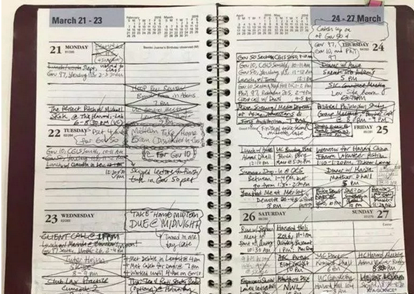 即将成为大三党的我,已在哈佛度过了一半的大学时光,一种怀旧的感觉萦绕心头,不管怎样,于我而言,这都是一个自我反省的好机会。 每日计划(每天要干的事情),我没有输进谷歌日历,而是使用纸质日历。 我在纸上划分成六个区域,每天占一个区域,这样每天要做的事情就可以对应的区域,这就是我的周计划了。 先在本子上写下自己的计划,完成一件就叉掉一件,这个过程赋予我一种奇怪的满足感。我也能真切感受到每天在校园内度过的时光。”