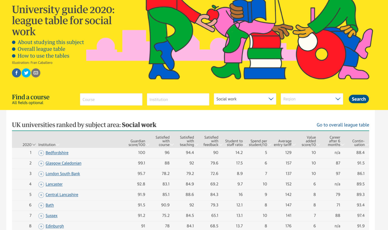 最新公布的卫报2020年英国大学专业排名中贝大的社会工作学一下跃居全英第1名 (妥妥地实力派)。从图中也可以看得出来,卫报的评分可以说是非常细致了,综合考虑了课程满意度、教学满意度、学生和教师比例等特定方面。