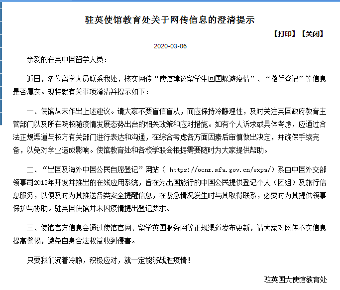 2020年3月6日,驻英国大使馆教育处发布《驻英使馆教育处关于网传信息的澄清提示》,具体内容如下: