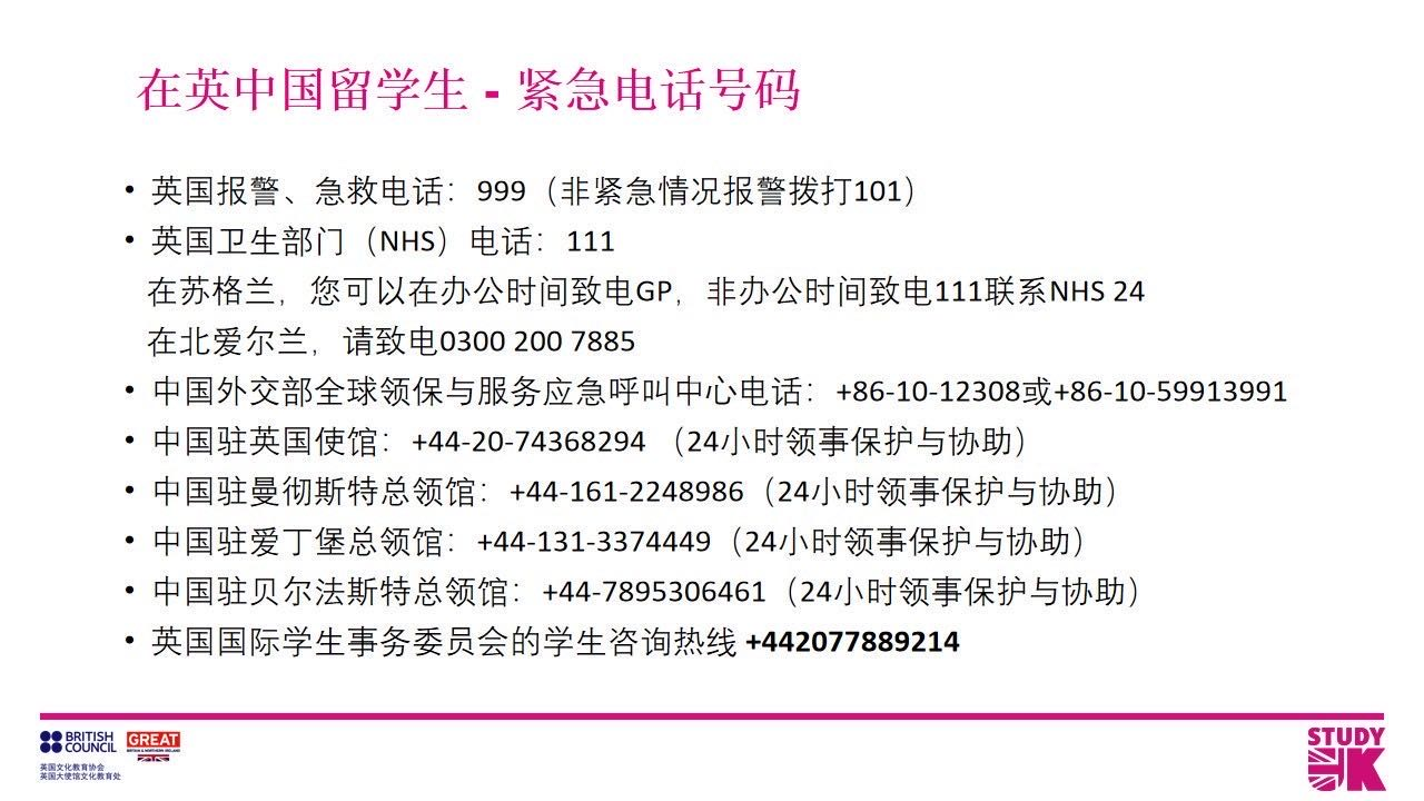 请广大留英学子,勿信谣,勿传谣,做好防护措施,必要时寻求帮助。在此附上在英紧急联系方式: