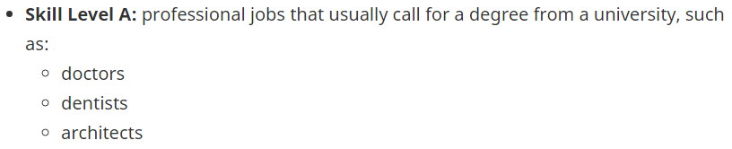 具体表现为从事需要专业知识学习的职位,包括律师、审计师、医生、牙医、建筑师、软件工程师等。要求申请人教育水平至少是本科或以上;不同的职业性质要求的语言级别也不同。
