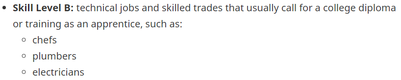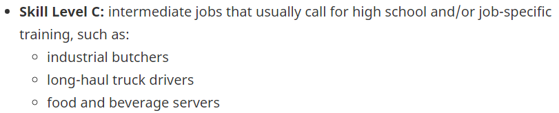 具体表现为需要进行专业培训的职位,包括厨师、电工、电子维修技师、行政人员、采购代理人员等。要求申请人教育水平专科或以上,并且接受过相关技能培训和学徒训练;这个等级的学历和语言要求较低。