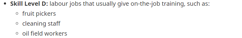 加拿大NOC职业列表划分的标准是按照技能等级,而技能等级的分类标准又是根据从业者的教育和培训,分为技能等级0、A、B、C、D这5大类。其中技能等级0、A、B类是移民职业;技能等级C、D两类会限制职业,虽然不能申请联邦技术移民,但可以申请部分省提名项目。大部分的移民类别都要求申请人有至少1年的工作经验,并且职位为0、A、B 类。