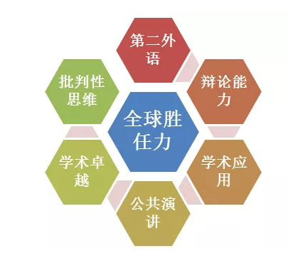 六大胜任力包括:批判思维、辩论能力、第二语言、公共演讲、学术卓越、学术应用六大能力。其涉及:思维能力、交流表达和创新学术三个方面。