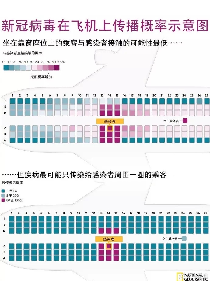 飞机座位紧凑,很容易吸入邻座的飞沫,若有病人接触过座椅,卫生间把手,病毒更容易传播,特别是坐在靠近患者周边,同排或前后两排,全程戴口罩是必须的。