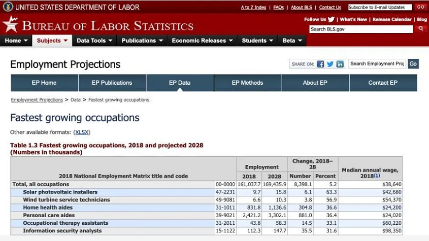 我们再来看美国劳工部数据统计署发布的2018-2028,未来10年的就业状况预测