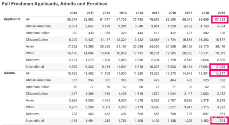 2019年加州大学伯克利分校(UCB)共收到直接申请87,398人,录取14,277人,录取率为16.3%;其中国际学生申请17,035人,录取国际生1543人,录取率仅为9.1%。