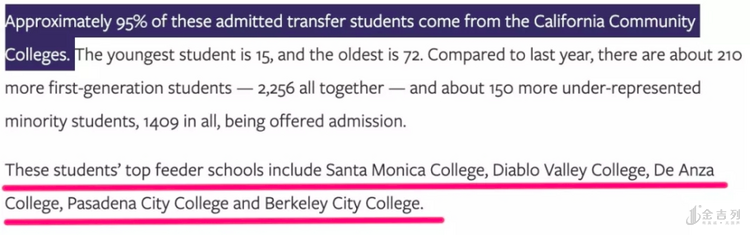 同时根据大学的统计,在以上录取的转学生中,有95%的学生来自加州的社区学院。这些学生主要来自圣莫妮卡学院、帕萨迪纳城市学院、伯克利城市学院等社区学院。
