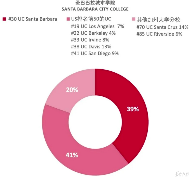 2019年加州大学圣塔芭芭拉分校(UCSB)共收到直接申请93,442人,录取27,719人,录取率为30%。而转学申请的录取率高达51%,且94%来自加州的社区学院。而在这些社区学院中,圣巴巴拉城市学院(SBCC)每年学校向UCSB输送学生数量在全美排名第1。