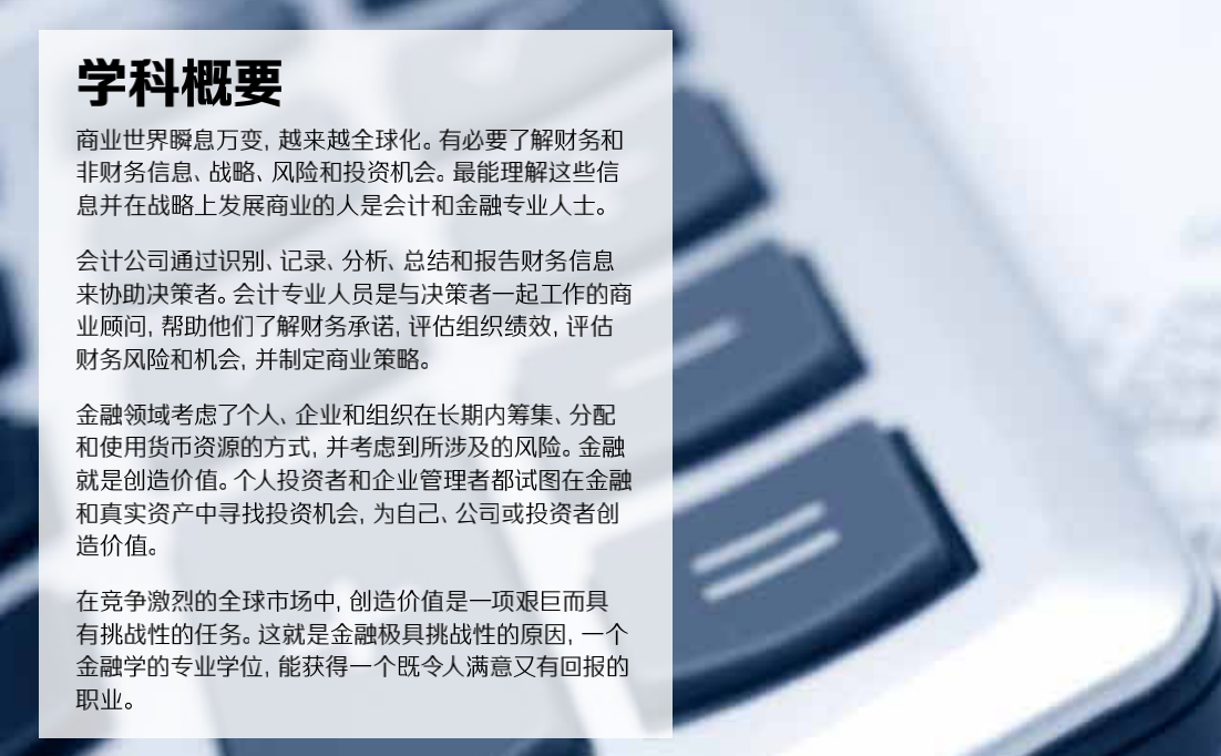 通过学习会计和金融,学生需要发展的职业技能和行业知识 会计和金融专业的专业化为学生提供了企业寻求的实用技能。 课程的重点是以职业为核心,让学生了解金融系统的整个价值链。林肯大学的学生通过使用模型和理论来理解价值是什么。他们学习强大的研究原则,并发展批判性思维的技能,以便能够评估和积极应对全球商业面临的挑战雇主寻求具有良好职业道德的全面发展的毕业生。