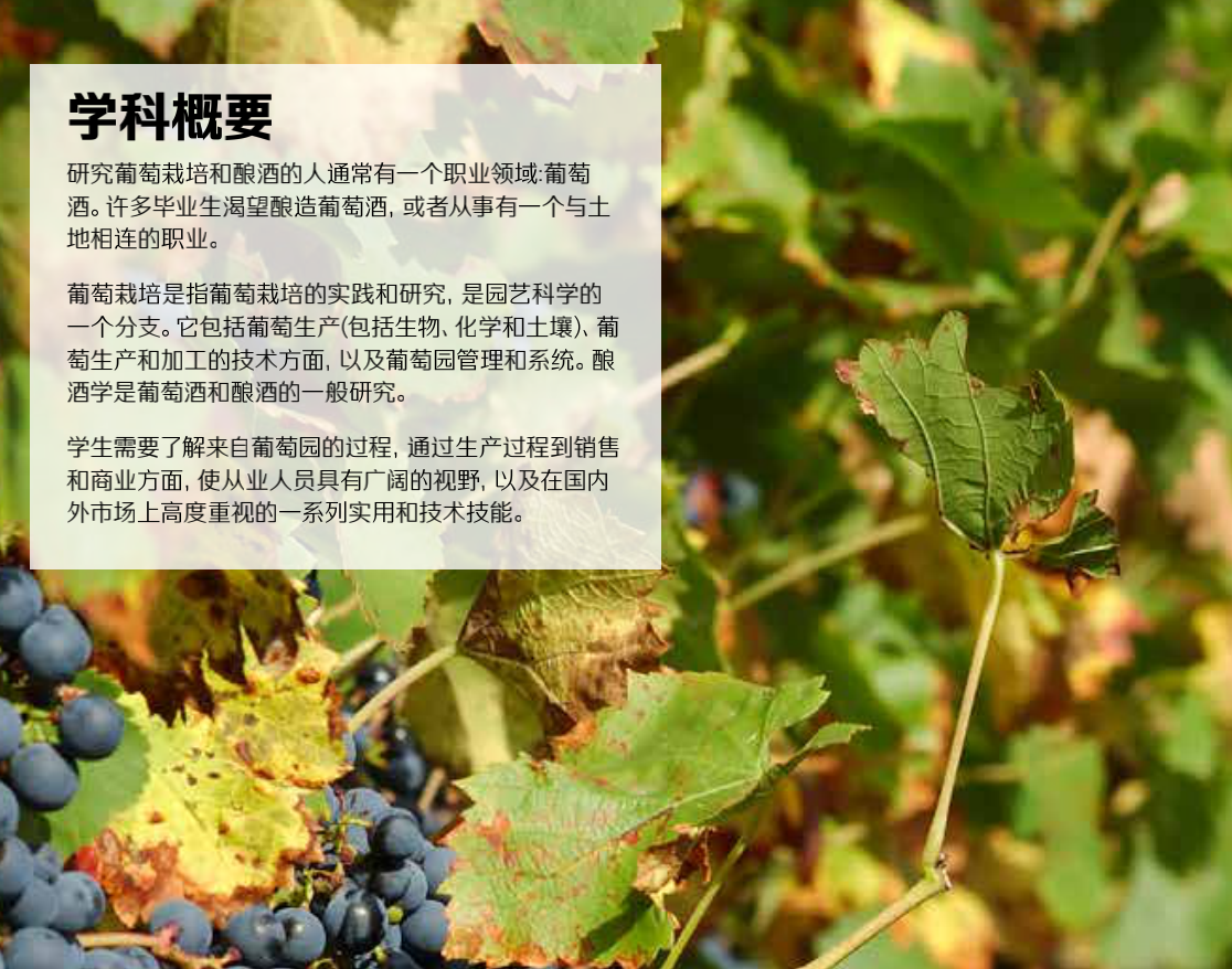 在新西兰(坎特伯雷、南岛北部和奥塔哥/南地地区),葡萄栽培者和其他专家的职位目前正处于技能短缺的名单上。希望在专业岗位上工作的毕业生通常需要经验,这可以通过在新西兰和世界各地的葡萄酒相关行业中的工作来获得。相关行业包括酿造、蒸馏和生产小众产品,比如有机葡萄酒,这些都是新西兰的成长型产业。葡萄酒旅游是另一个毕业生可以取得成功的增长行业。