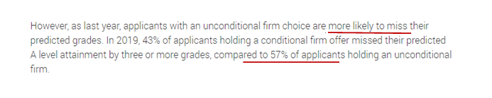 2019年, 57% 持有无条件录取的申请人没有达到预估成绩,但他们中的人凭借无条件offer进入了大学。