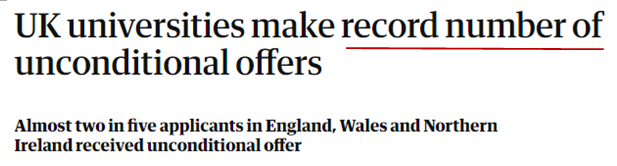 2014年起,在英国大学取消招生人数上限之后,各高校为争取生源展开了激烈竞争,不少大学倾向于在考试之前,就向一些优秀学生发出无条件offer。