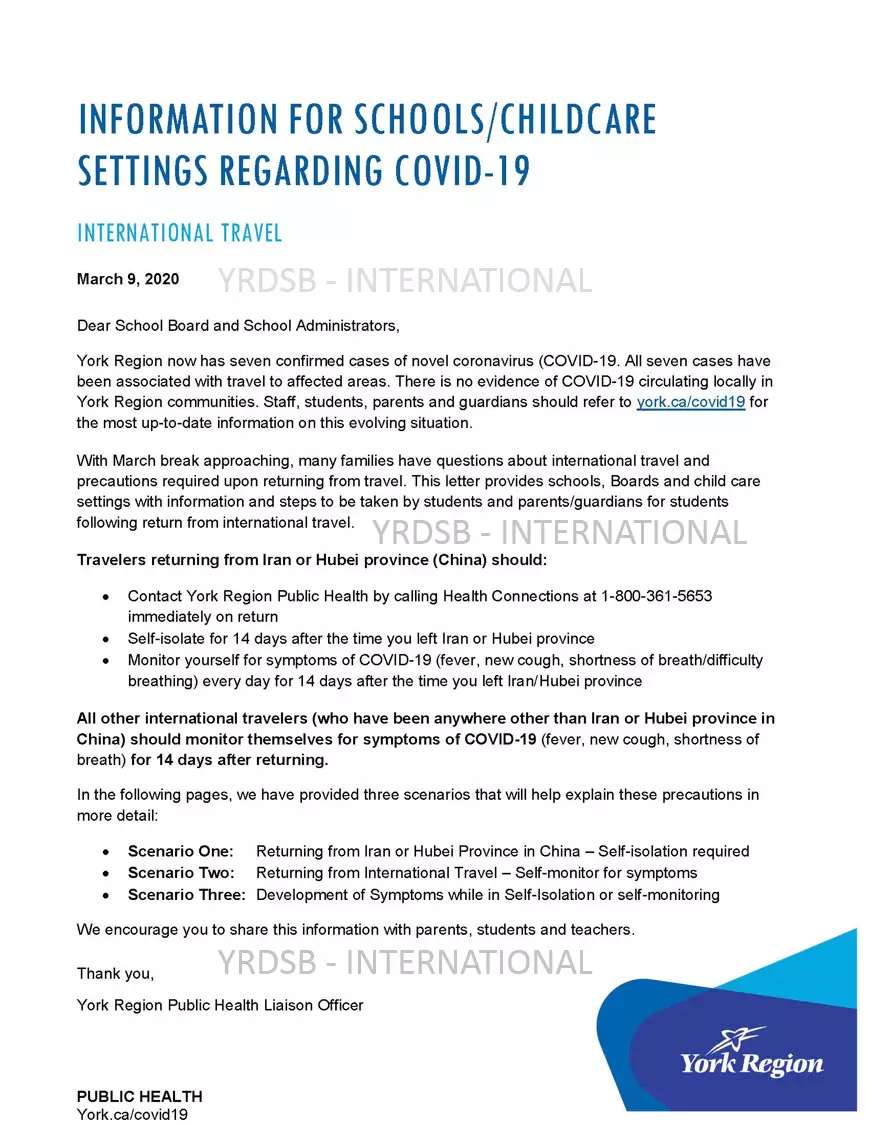 With March break approaching, many families have questions about international travel an precautions require upon returning from travel. This letter provies schools, Boars an chil care settings with information an steps to be taken by stuents an parents/guarians for stuents following return from international travel.