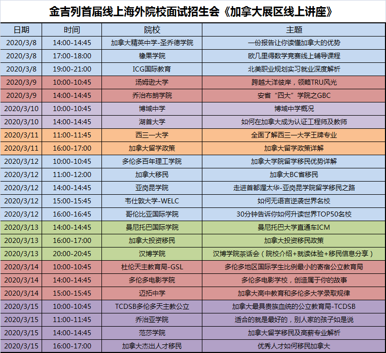 3月7日-3月15日是金吉列大学长首届线上展会周,更多讲座信息如下:如果您有任何留学,签证和移民的需求都可以联系王老师电话咨询或预约讲座:177-1066-1329