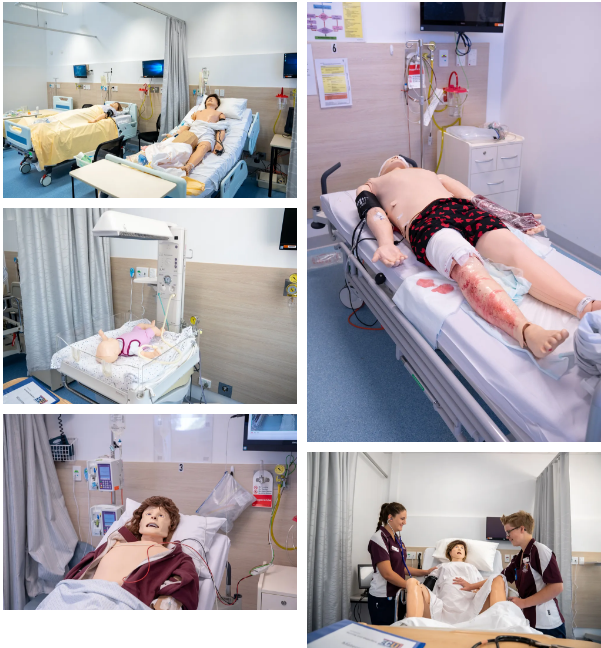 护理学院采用领先的仿真人教学模式,一系列的仿真人包括老年人,青年,儿童与婴儿。通过计算机操控,可以模拟出病人的症状与体征,包括血压,心率,疼痛反馈等