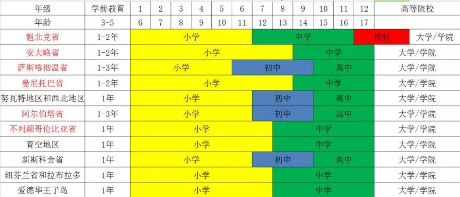 加拿大多采用12年制义务教育。魁省比较特殊采取11年制义务教育。虽然加拿大的学制并不如中国统一,但是基本上(除了魁省)都是12年的初等教育,因此中国学生申请入读加拿大学校,顺延入学即可。