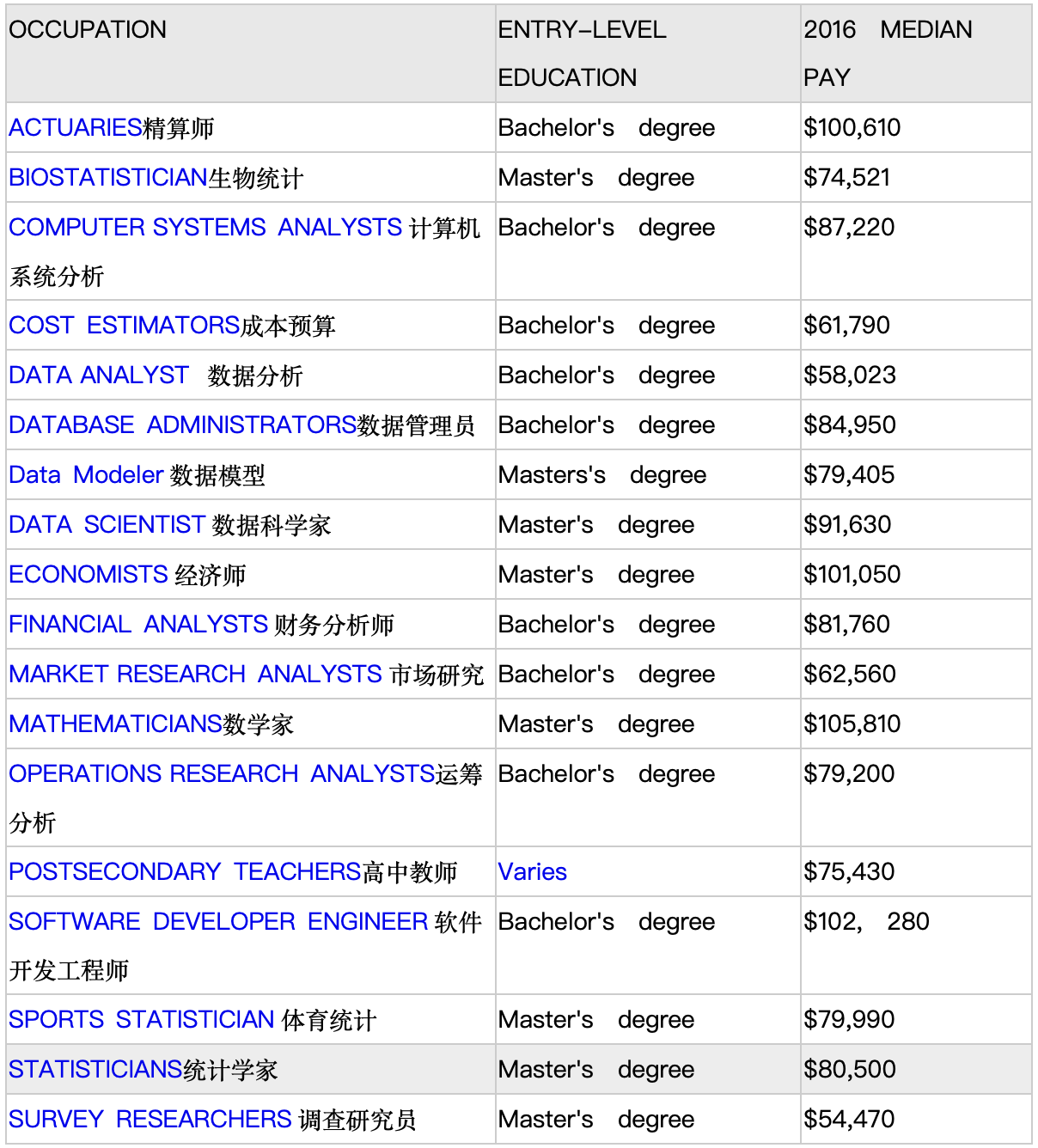 根据美国劳工局统计数据,2016-2026期间,数学和统计领域工作岗位预计涨幅为34%,远远高于所有行业的平均涨幅(7%)。常见的就职公司有:政府,保险,医药健康,工业和运营管理,银行和金融,学校。下表是美国统计学专业毕业生常见的职位和平均薪资概况: