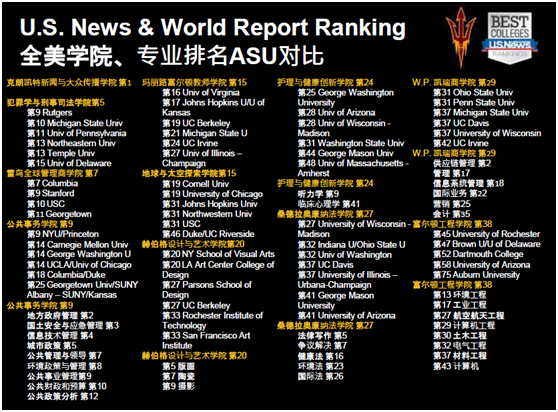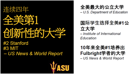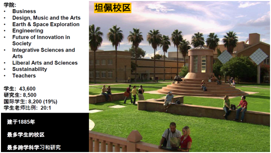 亚利桑那州立大学位于菲尼克斯市区,是一所顶尖的研究型大学,共有五个不同的校区。该校开创了美国高等教育的新模式,即让学生的优异学业与创业家精神得到了前所未有的完美结合。由于本科生人数排名全美第一,因此学校的专业设置非常广泛,并提供诸多选修课程。