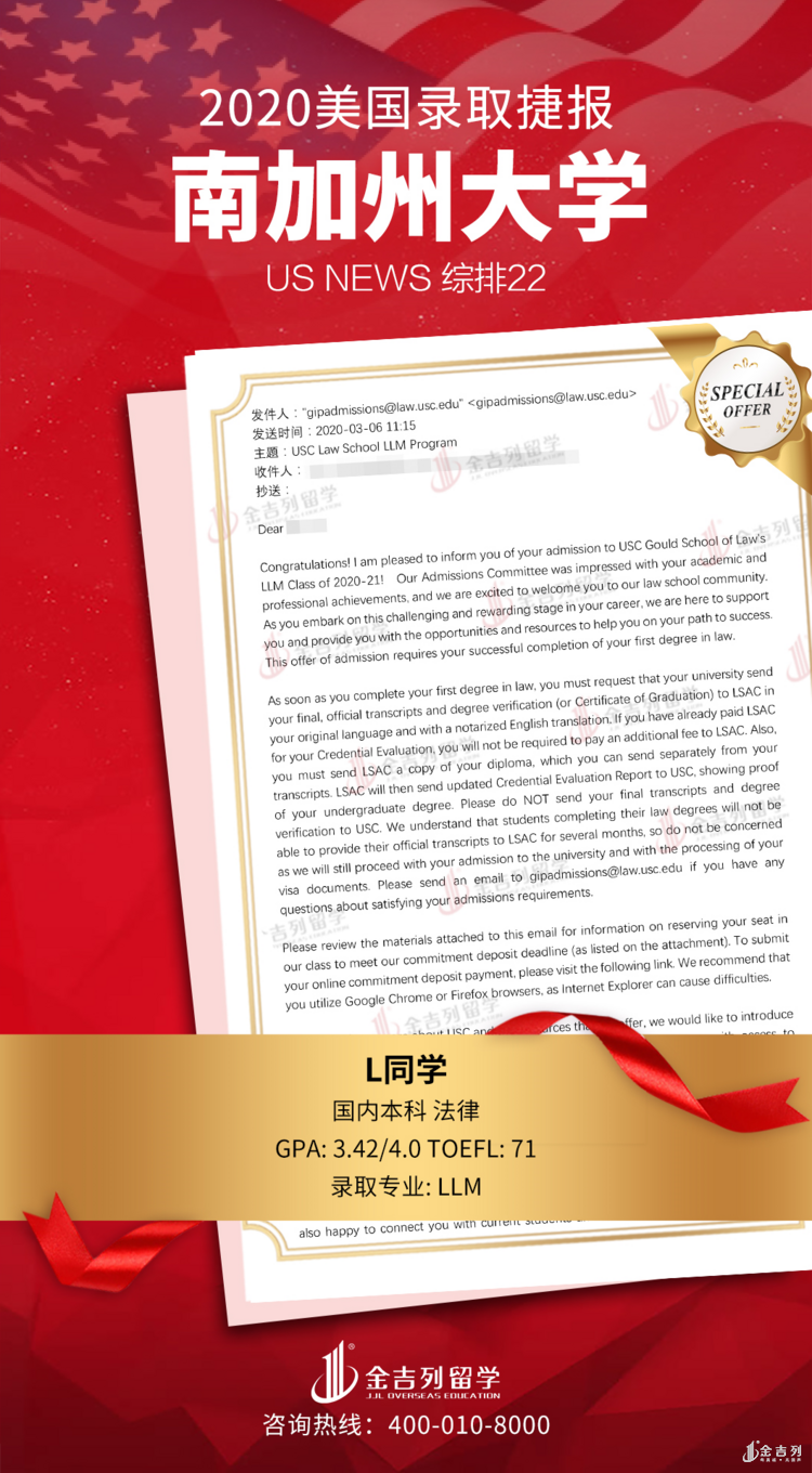 学校简介: 南加利福尼亚大学 (University of Southern California),又译南加州大学,简称南加大(USC),是美国西海岸最古老的顶尖私立研究型大学,世界著名高等学府,位于”天使之城”美国加利福尼亚州洛杉矶市,1880年由监理会创立,是美国大学协会(AAU)成员、环太平洋大学联盟成员。南加大已有一百多年的历史,其课程水平极受肯定,其中商学院、电影、传播、建筑、医学及理工学院等科系在美国大学中相当知名。南加大的众多学院均居全美前10。其中电影学院位列全美第1,南加大校友获得奥斯卡奖数量高居全美第一,史蒂文·斯皮尔伯格、”星战之父”乔治·卢卡斯等影坛巨匠均是该校校友。新闻学院位列全美第1,公共政策学院位列全美第4,建筑学院本科和研究院分别位列全美第5和第9,工程学院位列全美第8。 学校在硅谷的影响力位居前四。