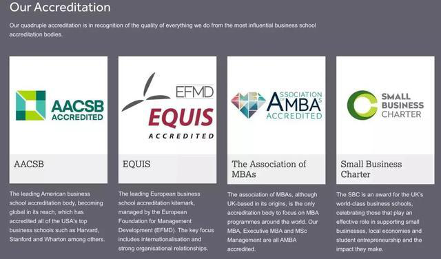 谈起商学院,“三重认证”可谓是对全球商学院极高的认可标准。AASCB、AMBA、EQUIS这三大权威认证,全球仅有1%的商学院全拥有。在全英100多所大学中,也只有21所商学院获此殊荣。