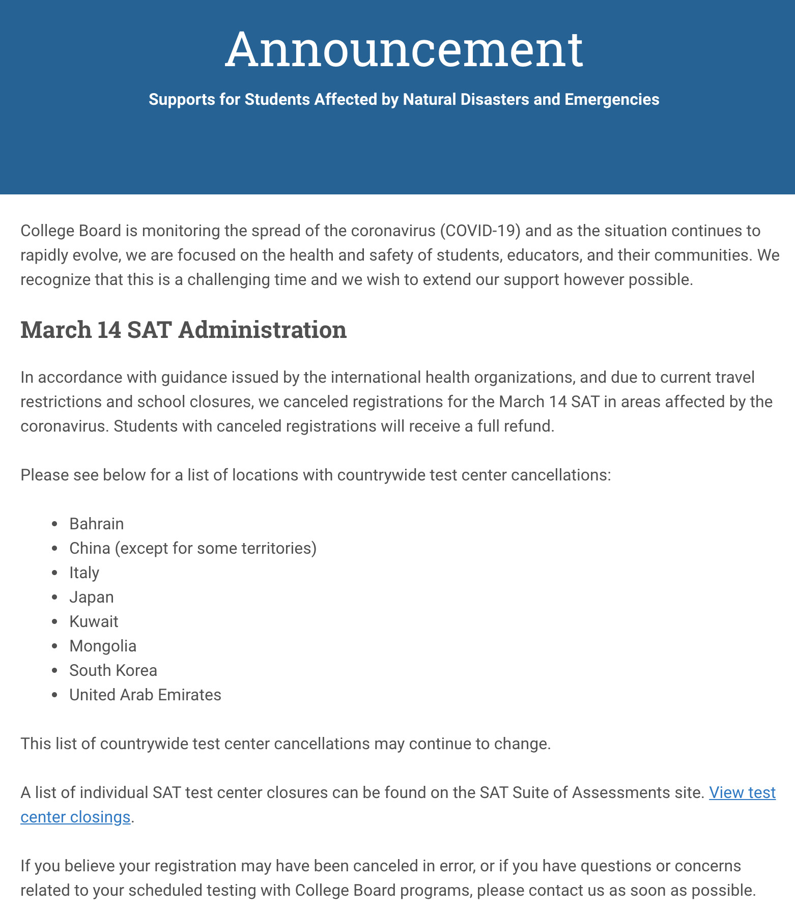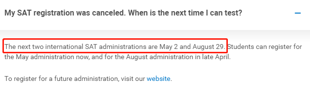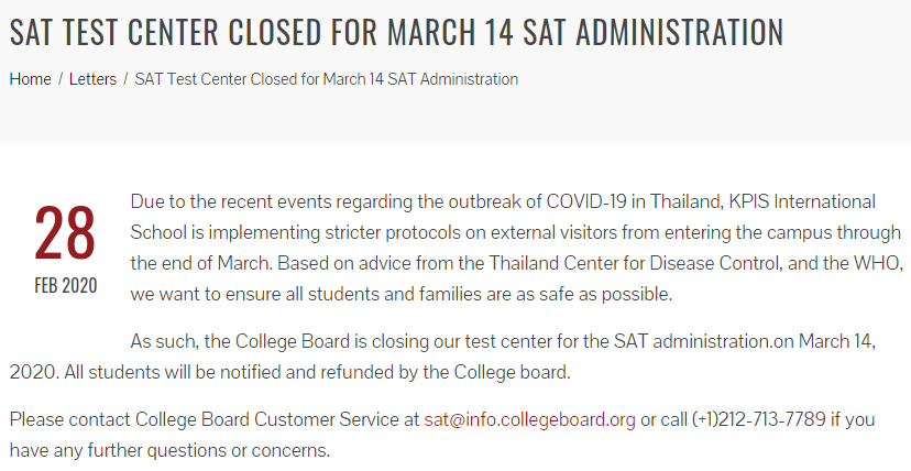 其实,早在公布取消3月份中国SAT考试的时候,已经明确了,国际考生可以等到4月份报考8月份的考试。在CB官网也有体现。随着近期疫情的发展,在全球49个国家都有疫情的爆发,因此为了公众健康考虑,部分国家的部分考场宣布3月份或取消,比如泰国的KPIS国际学校的考场就取消了。