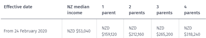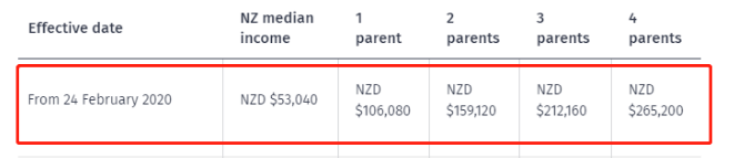 担保人的收入必须满足新西兰收入中位数,也就是说在成为新西兰永久居民或公民的3年内,至少有2年需要达到相关收入要求。除此之外,收入要求还要按照单人担保或是双人担保计算。