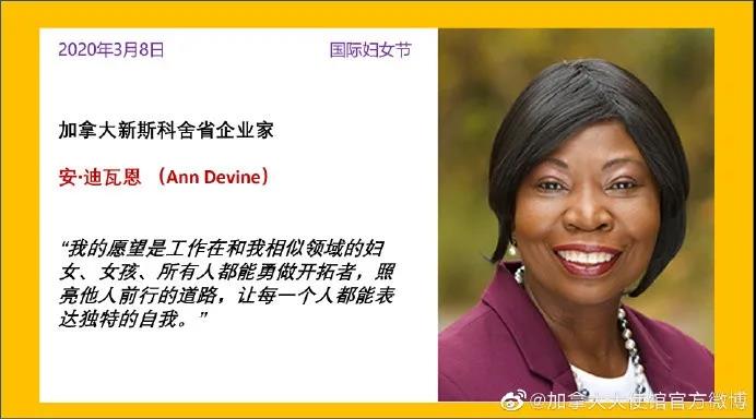 加拿大新斯科舍省女性企业家、黑人和移民女性就业倡导者安·迪瓦恩。 1 957 年出生于圭亚那,迪瓦恩在英国长大,2004年移居加拿大,2007至2014年在新斯科舍省人权委员会任职。 作为一位不知疲倦和直言不讳的女性倡导者,迪瓦恩不断创新和改进其服务。 她曾登上2017年1月《大西洋商业杂志》第一期女性专刊封面。 迪瓦恩获得了著名的奖项和荣誉,包括2018年哈利法克斯五大移民女性影响力人物奖。